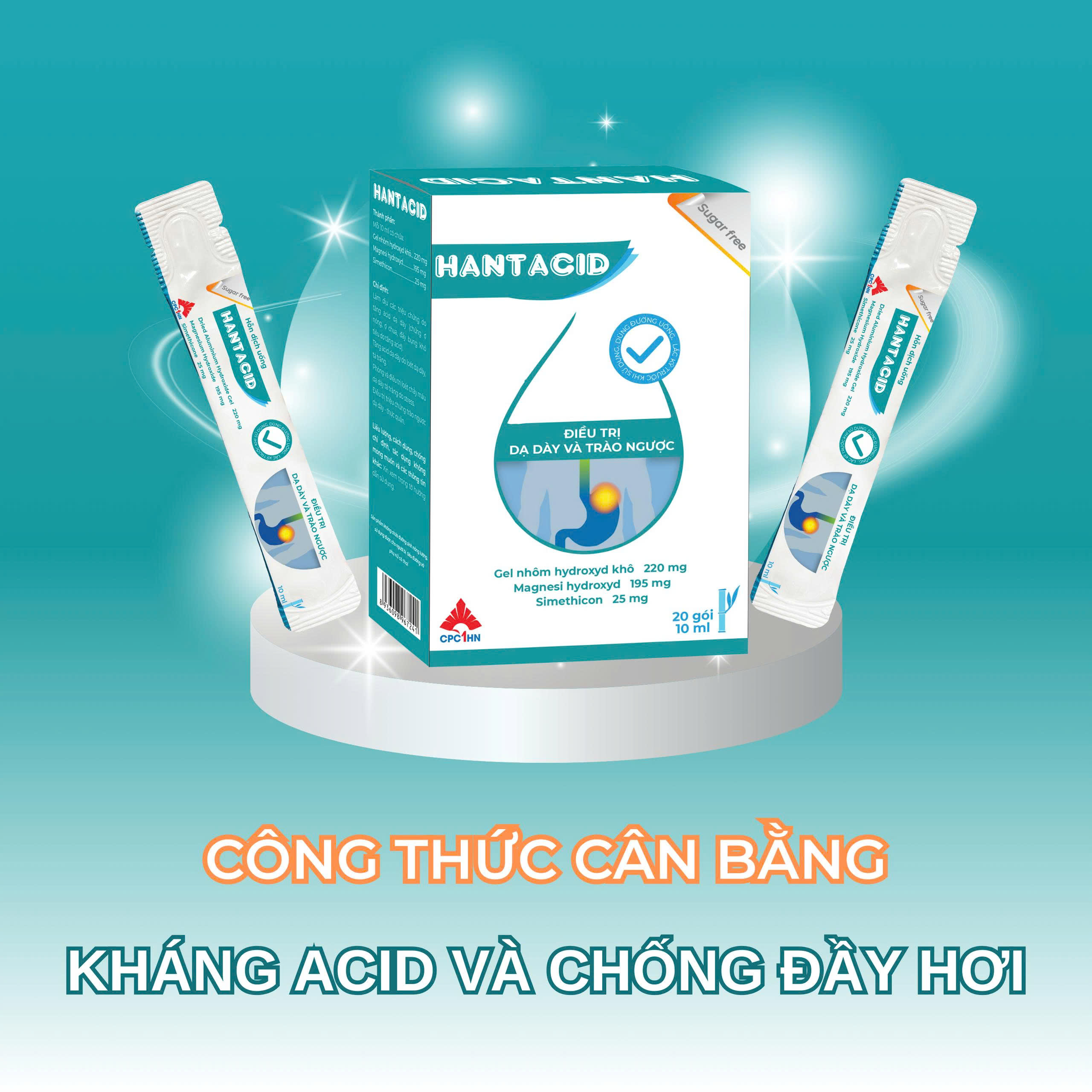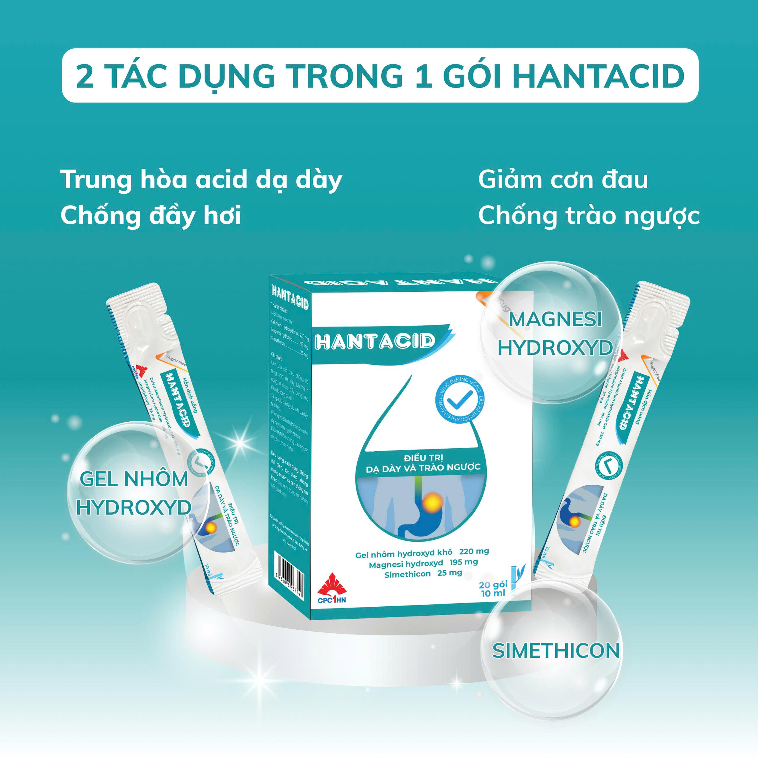 | Bào chế dạng gel 3D: | Điểm đặc biệt của thuốc Hantacid là được bào chế dạng gel 3D – một công nghệ cao trong bào chế thuốc dạng hỗn dịch, giúp giải phóng hoạt chất từ từ, tối ưu hóa tác dụng và duy trì hiệu quả kéo dài. |